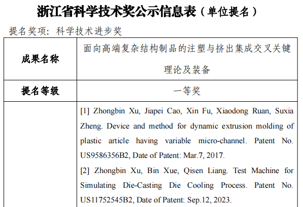 根據(jù)《浙江省科學(xué)技術(shù)廳關(guān)于開(kāi)展2023年度浙江省科學(xué)技術(shù)獎(jiǎng)提名工作的通知》有關(guān)要求,現(xiàn)將德清申達(dá)機(jī)器制造有限公司作為完成人工作單位的成果(成果名稱(chēng):面向高端復(fù)雜結(jié)構(gòu)制品的注塑與擠出集成交叉關(guān)鍵理論及裝備)相關(guān)內(nèi)容予以公示。公示時(shí)間:2024年8月9日-2024年8月15日。在公示期內(nèi)如有異議,可以來(lái)電或來(lái)信方式反映。凡匿名異議、超出期限異議的,不予受理。聯(lián)系人:金萍萍電話(huà):13706535940電子郵箱:Jinpp@injectionmachine.com